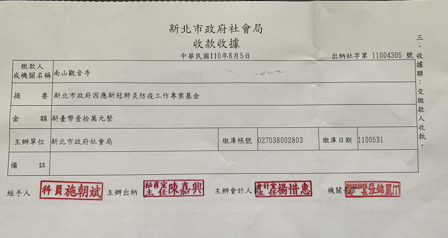 捐款:新北市政府因應新冠肺炎防疫工作專案基金