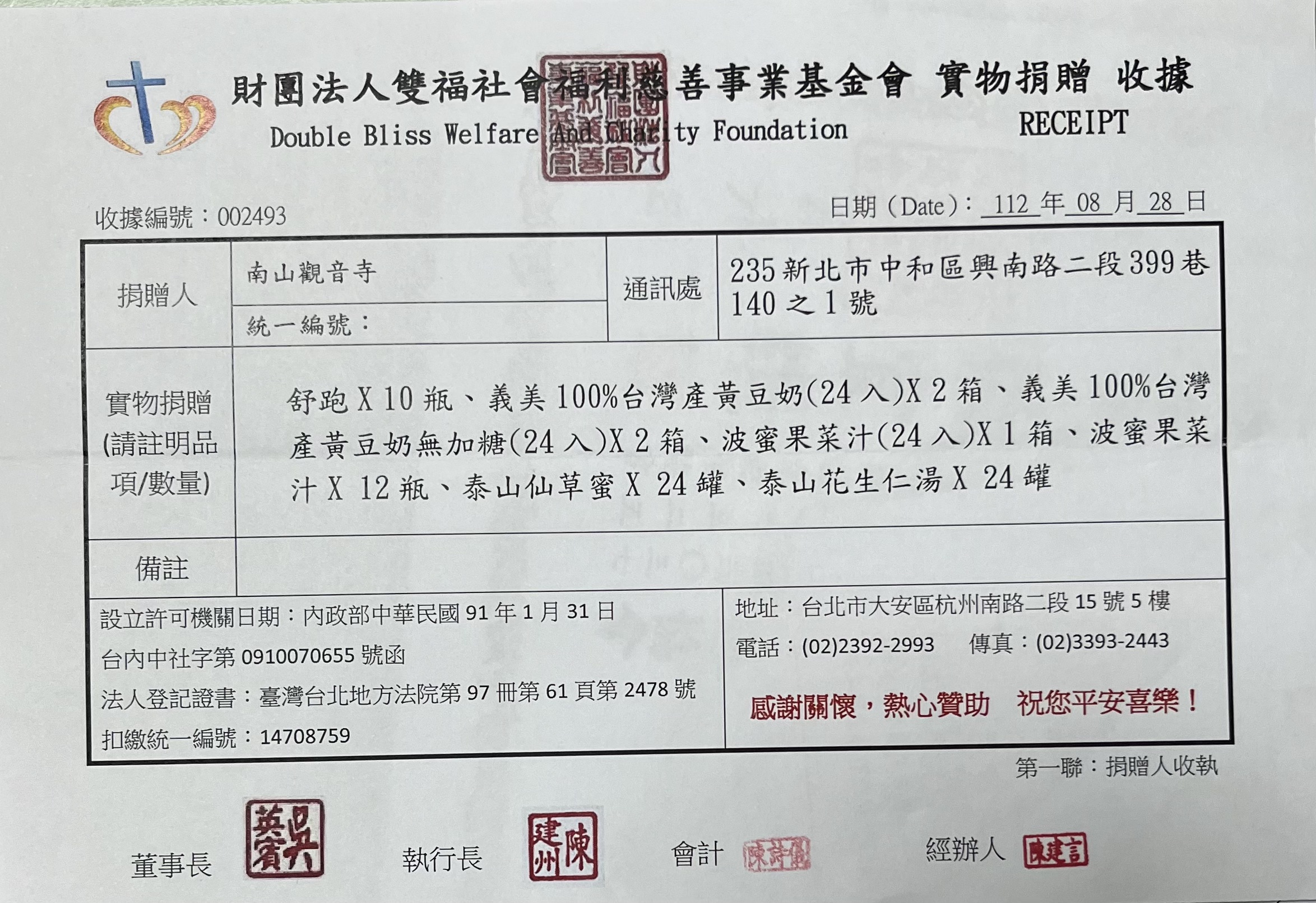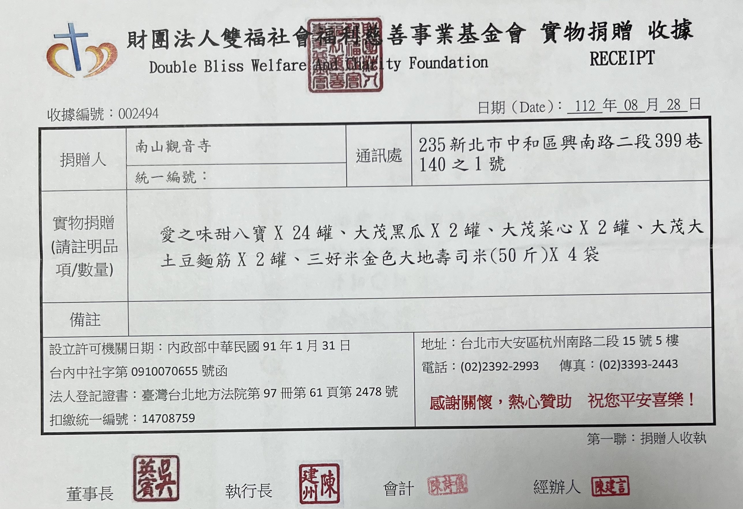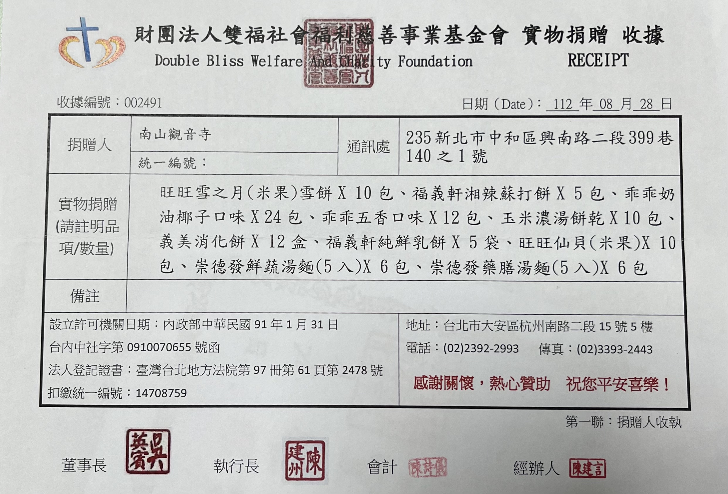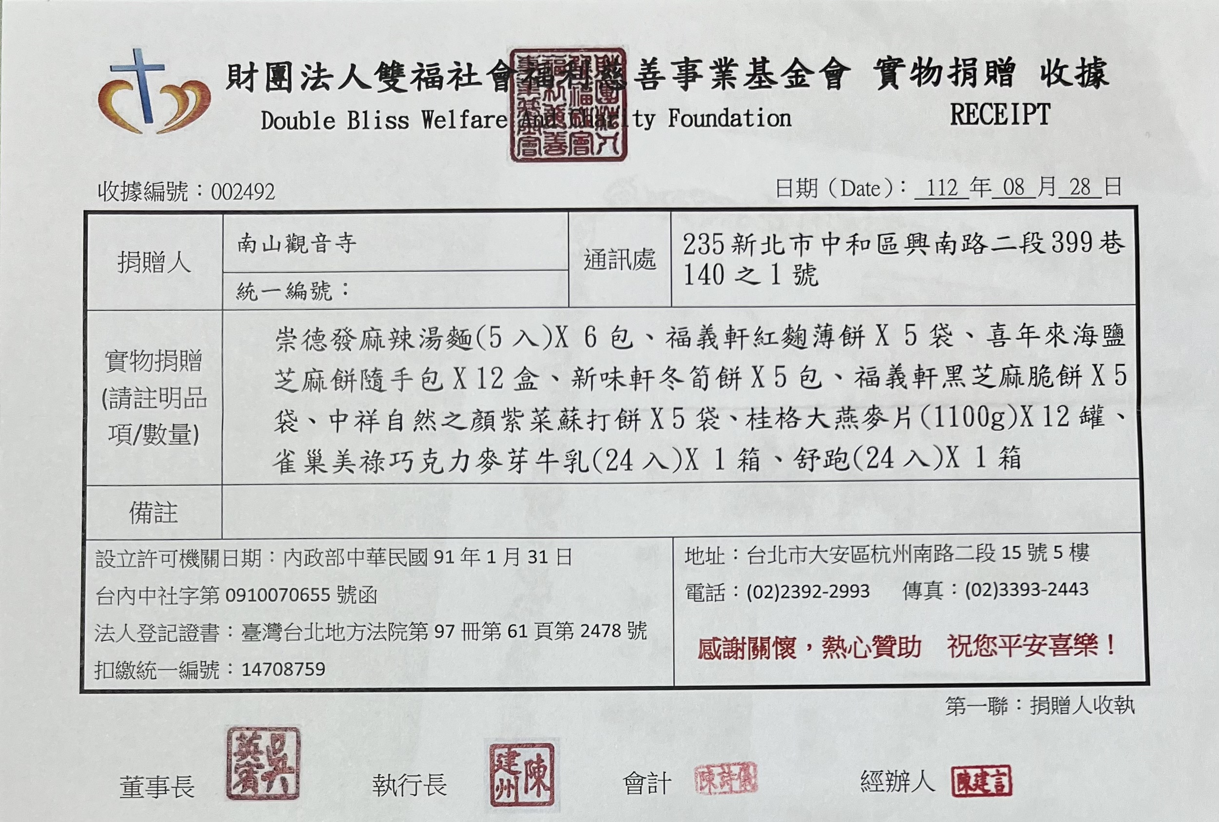 捐贈物資(雙福社會福利慈善事業基金會)