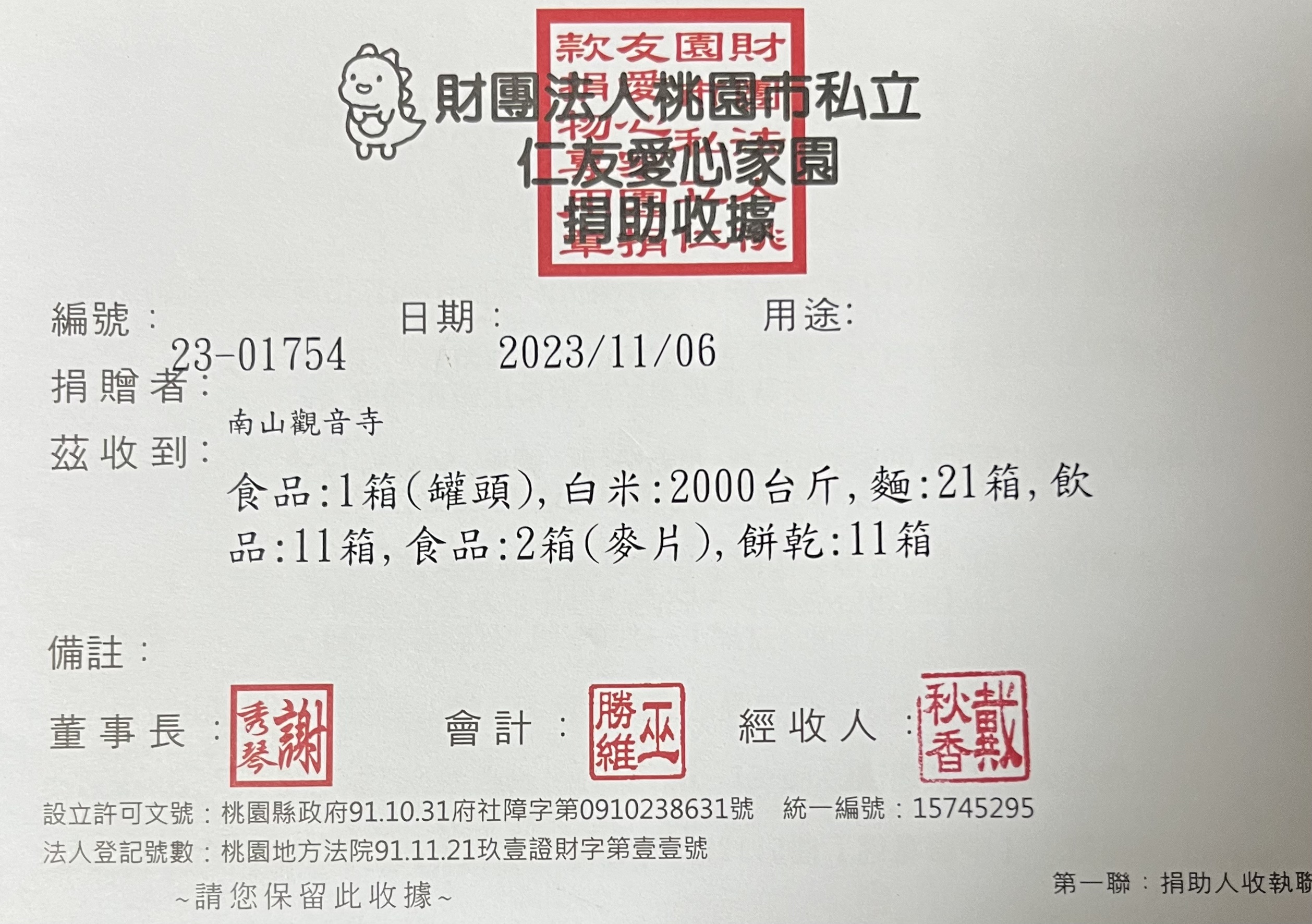 捐贈物資(財團法人桃園市仁友愛心家園)