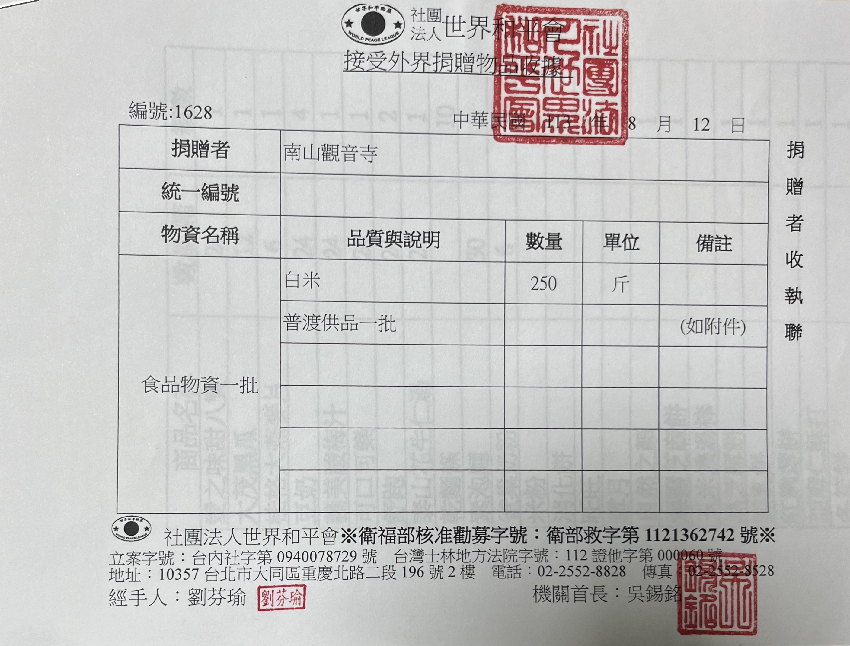 捐贈物資~ 財團法人世界和平會