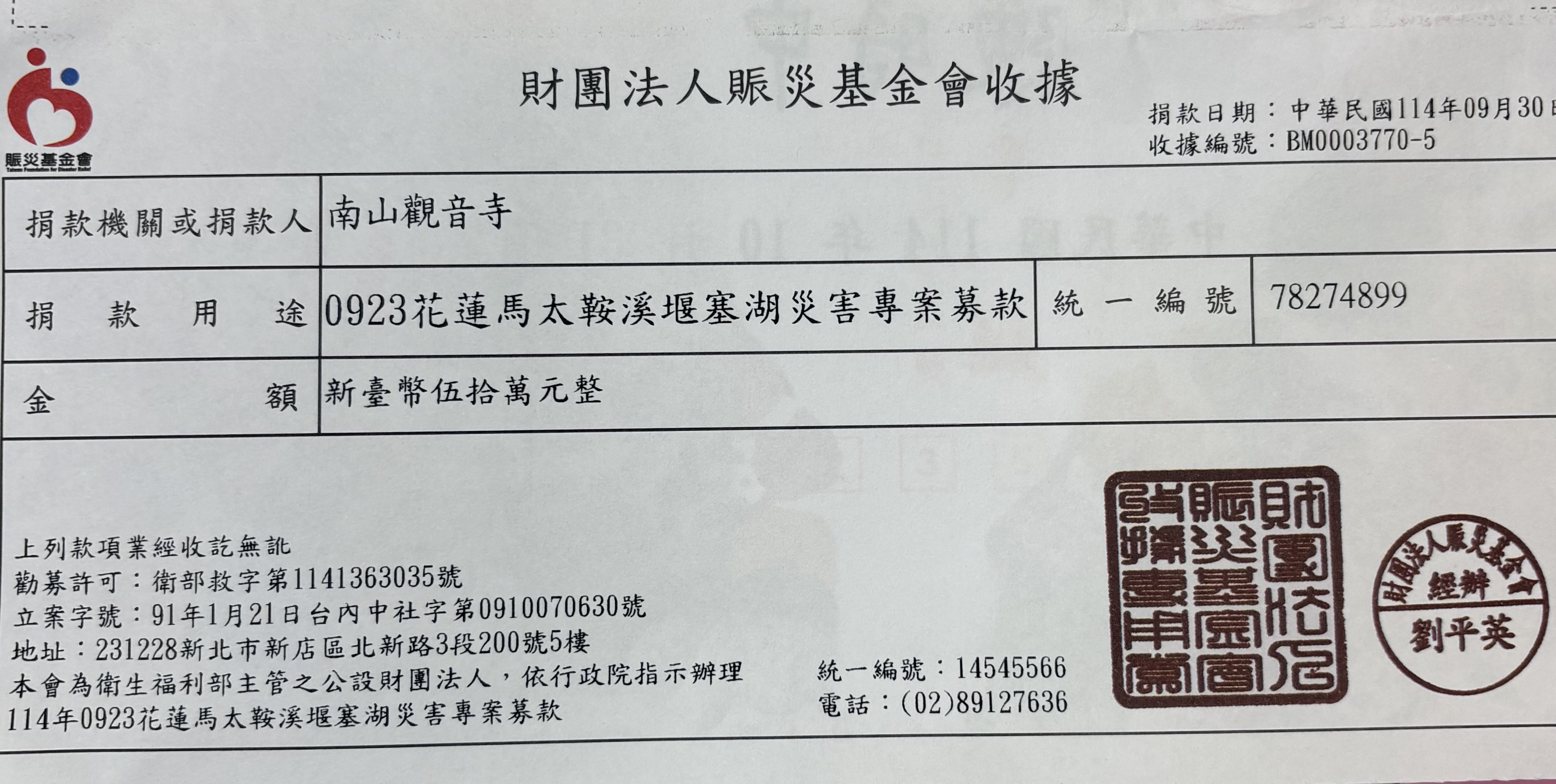 捐款~花蓮馬太鞍溪堰塞湖災害專案
