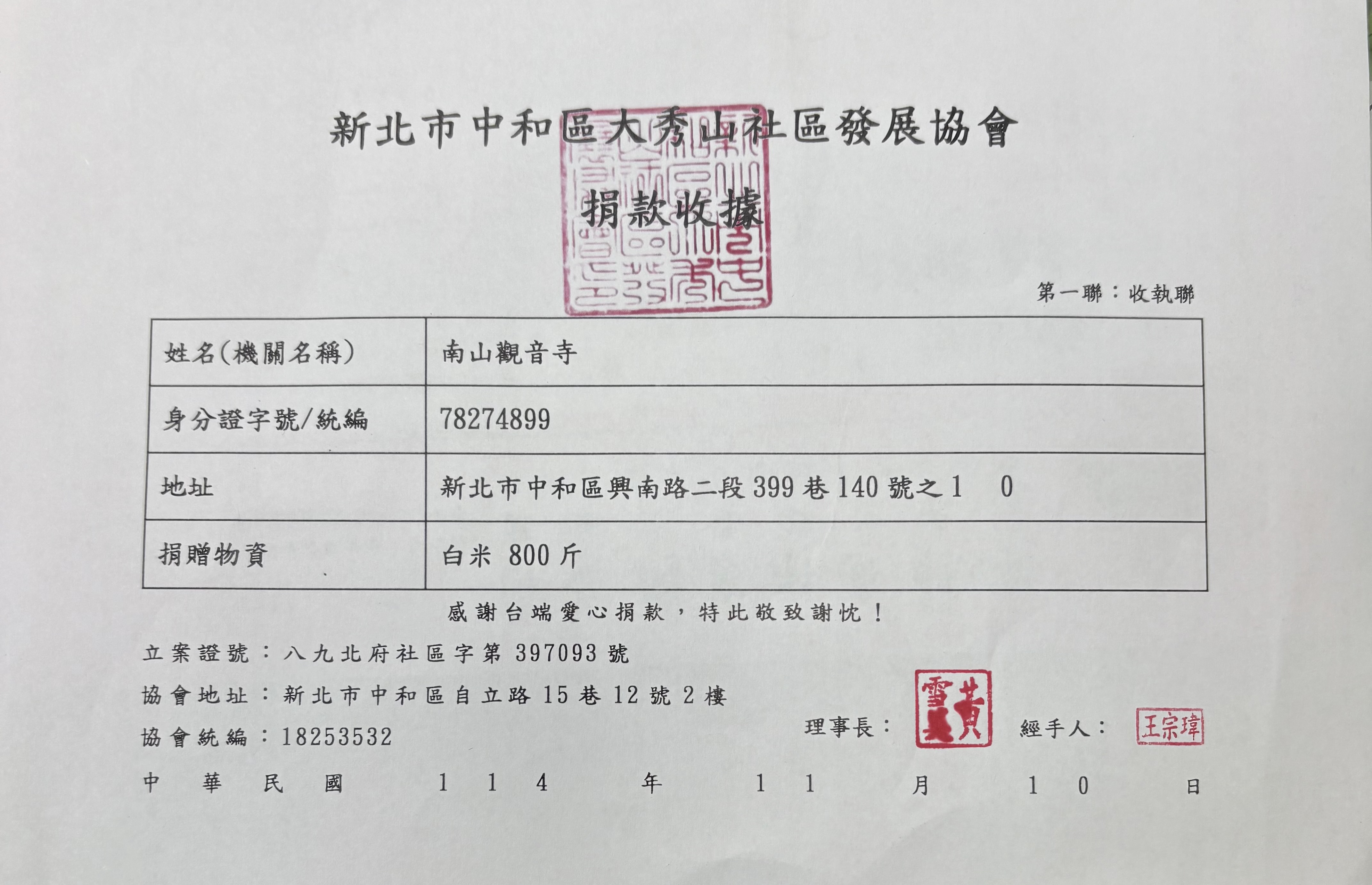 物資捐贈~中和大秀山地區發展協會